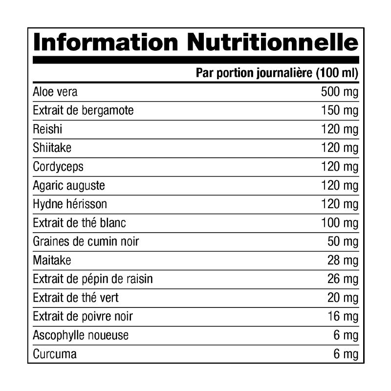 Eau, purée de mango (Mangifera indica), jus de prunes concentré (Prunus domesticus), jus de grenade concentré (Punica granatum), jus de mûres concentré (Rubus fruticosus), arôme (graines de lin fermentées et huile d’origan), jus de poires concentré (Pyrus communis), jus de canneberge concentré (Vaccinium oxycoccus), jus de griottes concentré (Prunus cerasus), jus de cassis concentré (Ribes nigrum L), jus de noni concentré (Morinda citrifolia), purée de fruit de mangoustan (Garcinia mangostana), purée de baies de goji (Lycium barbarum), purée de baies d’açaï (Euterpe oleracea), gel de feuille d’aloe vera (Aloe barbadensis), jus de fruit d’acérola (Malpighia glabra), dextrose, maltodextrine, jus de pêche concentré (Prunus persica), jus de pomme concentré (Malus domestica), jus de baies de sureau noir concentré (Sambucus nigra), arôme naturel, épaississant (gomme xanthane), Bergavit® 40 bergamote (Citrus bergamia Risso & Poit.), reishi en poudre (Ganoderma lucidum), shiitake en poudre (Lentinula edodes), cordyceps en poudre (Cordyceps sinensis), agaric auguste en poudre (Agaricus blazei), hydne hérisson en poudre (Hericium erinaceus), extrait de thé blanc (Camellia sinensis), graines de cumin noir (Nigella sativa), maitake en poudre (Grifola frondosa), extrait de pépin de raisin (Vitis vinifera), arôme naturel de fraise, extrait de thé vert (Camellia sinensis), édulcorant (glycosides de stéviol), extrait de poivre noir (Piper nigrum), purée de myrtille (Vaccinium augustifolium), purée de sureau noir (Sambucus nigra), purée d’orange (Citrus sinensis), ascophylle noueuse en poudre (Ascophyllum nodosum), rhizome de curcuma en poudre (Curcuma longa).