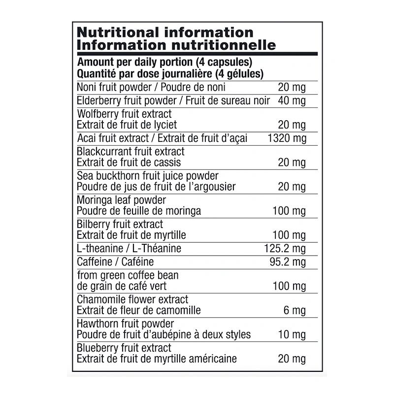 Extrait de fruit d’açai (Euterpe oleracea), stabilisant : hydroxypropylméthylcellulose, extrait de feuille de thé vert (Camellia sinensis), poudre de feuille de moringa (Moringa oleifera), extrait de fruit de myrtille (Vaccinium myrtillus), caféine de grain de café vert (Coffea arabica), poudre de son de riz (Oryza sativa), poudre de fruit de sureau noir (Sambucus nigra), poudre de fruit de Morinda citrifolia, extrait de fruit de lyciet (goji) (Lycium barbarum), extrait de fruit de cassis (Ribes nigrum), poudre de jus de fruit d’argousier (Hippophae rhamnoides), extrait de fruit de myrtille américaine (Vaccinium corymbosum), poudre de fruit d’aubépine à deux styles (Crataegus oxyacantha), extrait de fleur de camomille (Matricaria recutita).