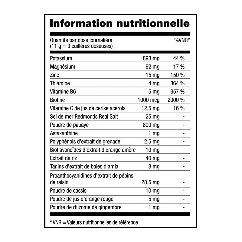 Édulcorant (érythritol), mélange de minéraux et de vitamines (citrate de potassium, poudre d’algue rouge marine (Lithothamnium calcareum), sels calciques de l’acide citrique, sels de magnésium de l’acide citrique, citrate de zinc, sel de mer, chlorhydrate de pyridoxine, chlorhydrate de thiamine), poudre de papaye (Carica papaya L.), régulateur d’acidité (acide citrique), arômes naturels, d-biotine, édulcorant (glycosides de stéviol issus de Stevia), extrait de jus de cerise acérola (Malpighia glabra), extrait de riz (Oryza sativa), extrait de pépins de raisin (Vitis vinifera L.), extrait d’orange amère (Citrus aurantium), extrait de baie alma (Emblica officinalis), astaxanthine, extrait de cassis (Ribes Nigrum L.), extrait de grenade (Punica granatum L.), poudre de jus d’orange sanguine (Citrus x sinensis), poudre de rhizome de gingembre (Zingiber officinale).