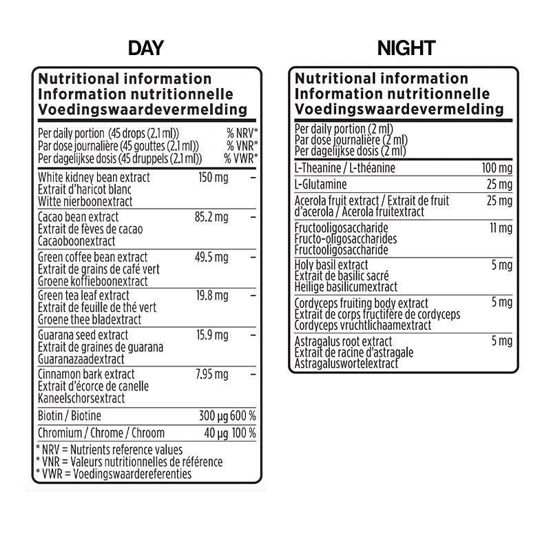 Gouttes Jour : Eau, humectant (glycérol), extrait d’haricot blanc (Phaseolus vulgaris), édulcorant (érythritol), extrait de fèves de cacao (Theobroma cacao), arôme naturel, extrait de grain de café vert (Coffea arabica), correcteur d’acidité (acide citrique), extrait de feuille de thé vert (Camellia sinensis), extrait de graines de guarana (Paullinia cupana), extrait d’écorce de canelle (Cinnamomum cassia), conservateur (sorbate de potassium), D-biotine, chlorure de chrome (III), édulcorant (glycosides de stéviol issus de stevia).