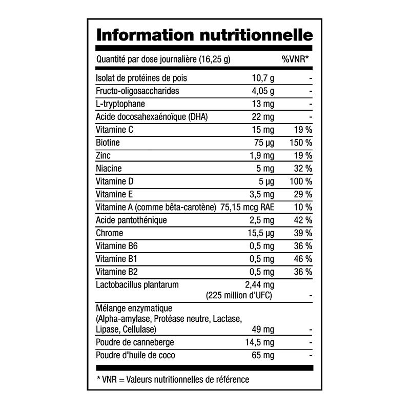 Isolat de protéines de pois, fructo-oligosaccharides, arôme, émulsifiant (lécithine), huile de microalgues (Schizochytrium sp.), épaississant (gomme de xanthane, gomme de guar), oxyde de magnésium, sels calciques de l’acide orthophosphorique, édulcorant (glycosides de stéviol), mélange de minéraux et de vitamines [l-ascorbate de calcium, gluconate de zinc, d-biotine, d-alpha-tocophéryle-acétate, nicotinamide, calcium d-pantothénate, riboflavine, chlorhydrate de pyridoxine, chlorhydrate de thiamine, bêta-carotène, cholécalciférol, picolinate de chrome, iodure de potassium], mélange d’enzymes [alpha amylase, protéase neutre, lactase, lipase, cellulase], cacao en poudre reduit en matiere grasse, poudre d’huile de coco (Cocos nucifera), son de riz (Oryza sativa L.), poudre de fruit de canneberge (Vaccinium macrocarpon), l-tryptophane, lactobacillus plantarum.